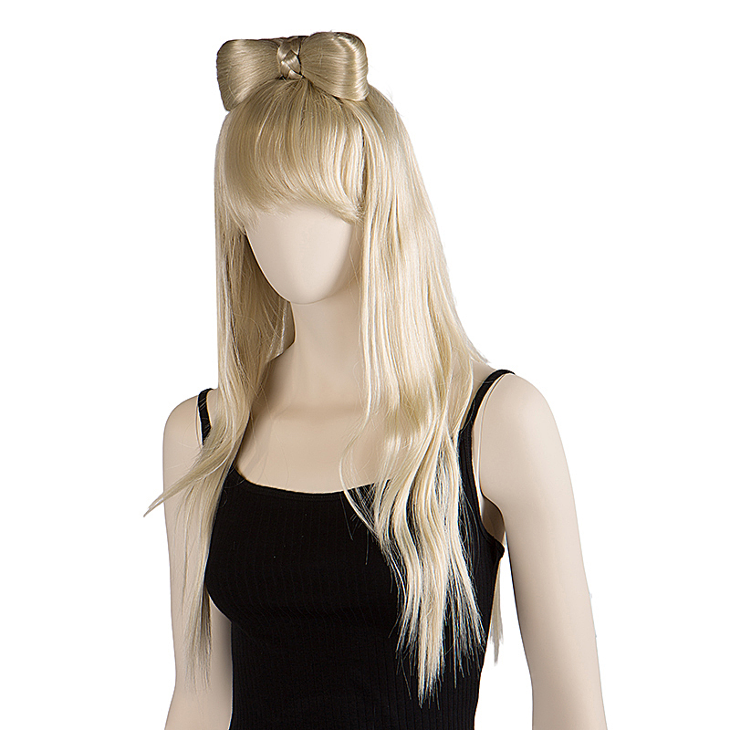 Περούκα γυναικεία για κούκλα βιτρίνας, πλενόμενη, με δίχτυ στην εσωτερική πλευρά, χρώματος ανοιχτό ξανθό light blond, μήκος μακρύ ασσύμετρο, χτένισμα ίσιο με αφέλειες και αποσπώμενο φίογκο.